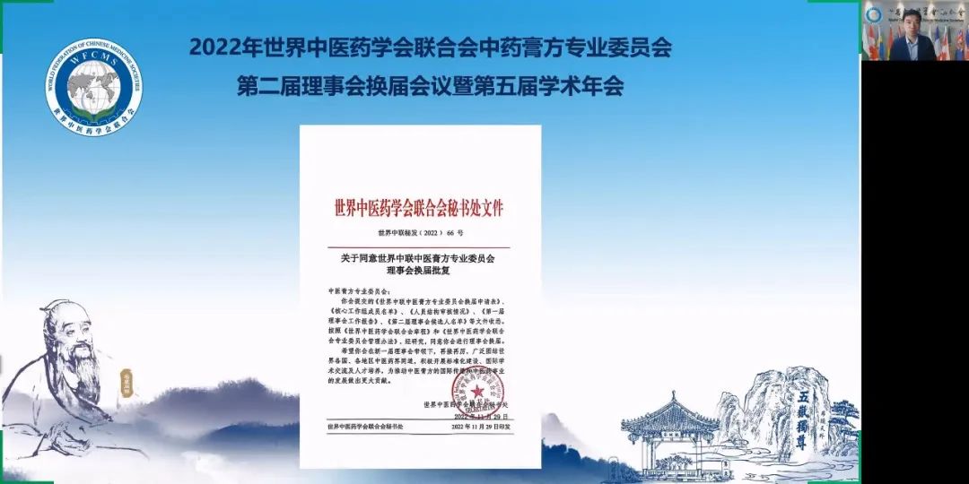 2022年12月4日上午,世界中醫(yī)藥學會聯合會(世界中聯)中醫(yī)膏方專業(yè)委員會第二屆理事會換屆會議暨第五屆學術年會通過線上方式隆重召開。世界中聯主席馬建中向大會發(fā)來視頻致辭,學術部主任焦云洞代表世界中聯參加大會,全國政協委員、首都名中醫(yī)、享受國務院政府特殊津貼專家、世界中聯中醫(yī)膏方專業(yè)委員會會長、北京康益德中西醫(yī)結合肺科醫(yī)院董事長兼院長董瑞和顧問、副會長、常務理事、理事及會員共335人參加了大會。其中來自匈牙利、葡萄牙、澳大利亞、俄羅斯、瑞典、波蘭、英國、美國、芬蘭、韓國、中國香港、中國澳門、中國臺灣等地的外籍專家學者65人。會議由第一屆理事會秘書長秦洪義教授主持。