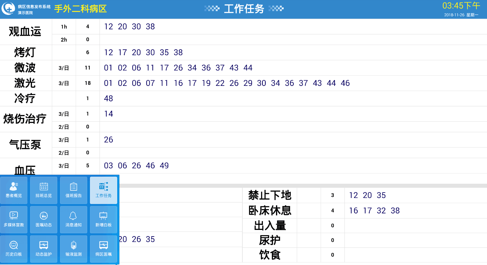 根據(jù)護(hù)理部、護(hù)士長(zhǎng)要求數(shù)據(jù)配置,結(jié)合移動(dòng)護(hù)理系統(tǒng)數(shù)據(jù),展現(xiàn)當(dāng)前病區(qū)未完成工作任務(wù)統(tǒng)計(jì),包括醫(yī)囑執(zhí)行、體征測(cè)量、護(hù)理操作等工作任務(wù)