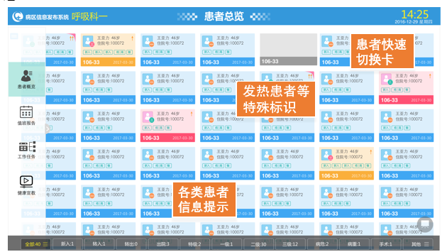 通過(guò)矩陣標(biāo)簽式患者視圖,概覽整個(gè)病區(qū)情況,并可以快速點(diǎn)選、交互查看不同類型患者信息,通過(guò)圖形化方式展現(xiàn)患者類型、出入院情況、基本信息、發(fā)燒情況、護(hù)理級(jí)別、病情危重程度等。