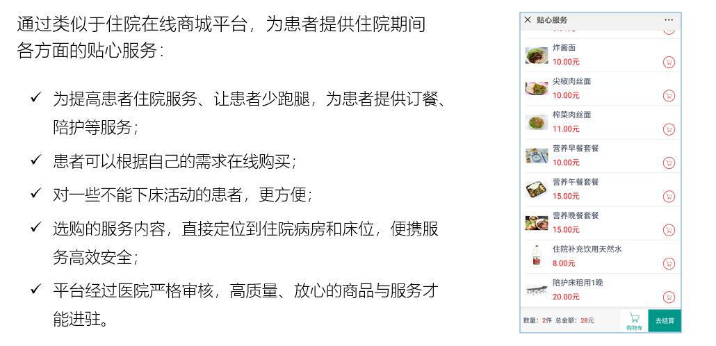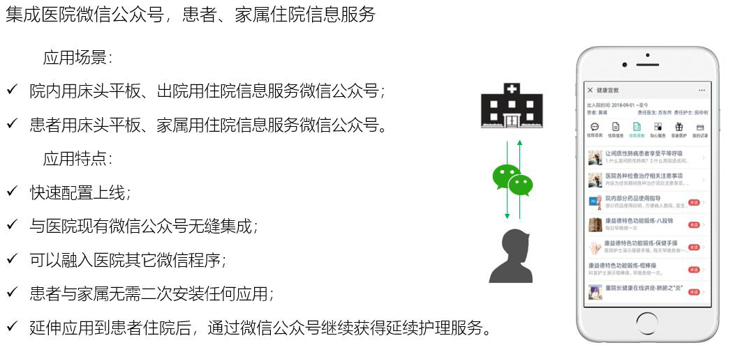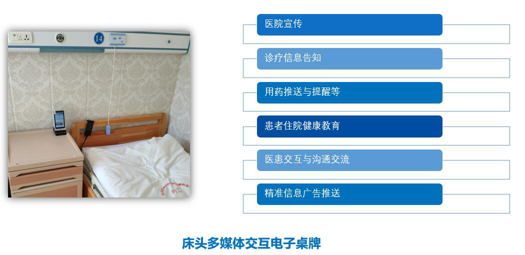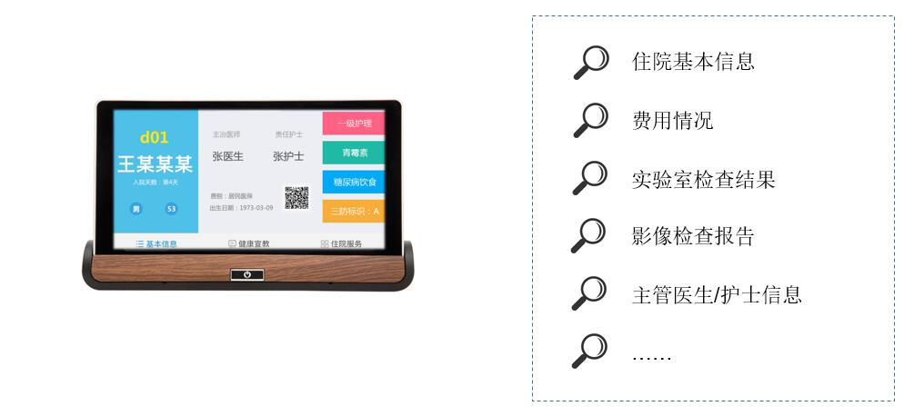 拓展床旁醫(yī)護(hù)、營養(yǎng)點(diǎn)餐、患者貼心服務(wù)、醫(yī)患交流、住院宣教、健康指導(dǎo)等功能,改善住院服務(wù)流程,改善患者就醫(yī)體驗,優(yōu)化醫(yī)患交互,改善醫(yī)療服務(wù)模式,提升智慧醫(yī)療的效率和水平。