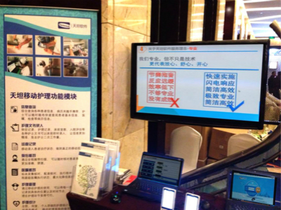 展會期間我公司接待了觀展及參展人員數(shù)百人,眾多人員關切詢問我公司產(chǎn)品,本次展會我公司展出了天坦移動護理系統(tǒng),天坦移動查房系統(tǒng),及醫(yī)療大數(shù)據(jù)分析平臺,通過現(xiàn)場演示受到了眾多專業(yè)人士和媒體的高度關注,尤其是天坦移動護理系統(tǒng)吸引了眾多觀眾的眼球。