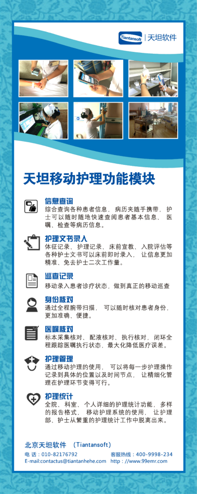 天坦移動護理系統(tǒng)改變傳統(tǒng)護理工作模式。將審藥、配藥、治療等環(huán)節(jié)實現(xiàn)移動化、條碼化、共享化。確保信息準確,用藥安全;系統(tǒng)將護理工作變得更方便、更自由,護士可以在任何地點調取病歷、化驗報告、檢查影像,利用各種移動終端完成醫(yī)囑執(zhí)行、床前護理文書錄入等護理操作,極大地減少護理管理人員的工作量,提高整個護理工作的工作效率與醫(yī)療質量。