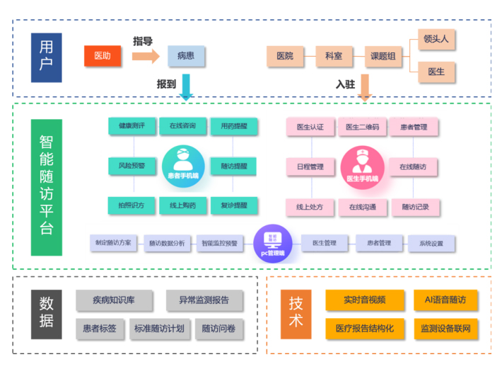 天坦智能開發(fā)的慢病管理運營服務(wù)是一套完整的心血管隨訪標準體系,配合適用性極強的醫(yī)生端可配置界面,滿足絕大多數(shù)開展冠心病介入的醫(yī)療機構(gòu)需求,同時,基于專家隨訪團隊之間的協(xié)作,建立上下聯(lián)動的醫(yī)生互動機制,為隨訪的患者提供專業(yè)的管理方案。匹配有人工智能為核心的隨訪管理機制,可自動化發(fā)送患者所需要信息,量表等隨訪內(nèi)容,具備機器學(xué)習功能,針對不同醫(yī)院形成不同模式的隨訪系統(tǒng)配置,匹配個性化的醫(yī)院隨訪體系,最終以患者交流平臺,建立以患者需求為中心的線上服務(wù)體系,包括專家線上咨詢、藥品直送、可穿戴式設(shè)備居家監(jiān)護、護理居家康復(fù)及圍繞手術(shù)全周期的保險支付產(chǎn)品。形成以醫(yī)學(xué)+智能+個性化+支付功能為一體的新一代的慢病管理平臺。