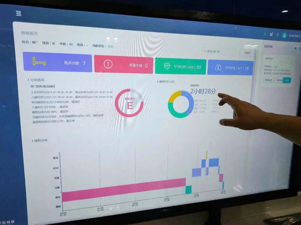 除了輸液外,患者的生命體征和運(yùn)動(dòng)軌跡也是醫(yī)護(hù)人員需要時(shí)刻操心的問(wèn)題。智慧病房搭建智能在床實(shí)時(shí)監(jiān)測(cè)系統(tǒng),在床墊下放置了傳感器,可以精準(zhǔn)測(cè)量和傳輸患者的生命體征、睡眠、離床等數(shù)據(jù),一旦數(shù)據(jù)異?;蛘呋颊唛L(zhǎng)時(shí)間不在監(jiān)測(cè)范圍內(nèi),系統(tǒng)會(huì)自動(dòng)進(jìn)行異?;螂x床、跌落等警報(bào),可以及時(shí)避免意外事件發(fā)生。